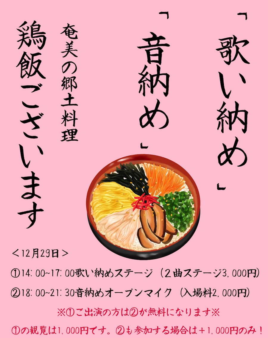 「歌い納めステージ&音納めオープンマイク」 奄美の郷土料理「鶏飯」振舞います! 紅白歌合戦にするかも!? (