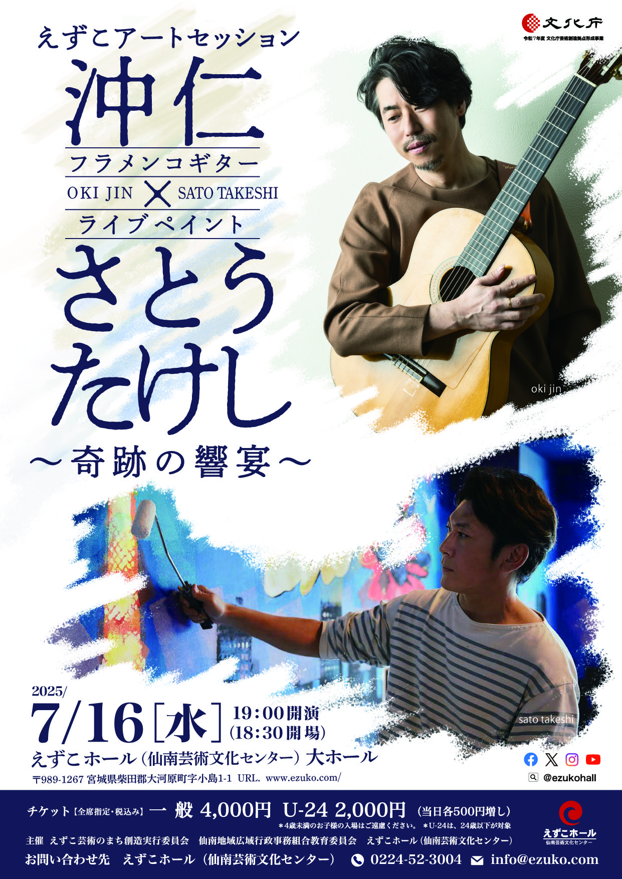 フラメンコギター国際コンクール(スペイン)でアジア人として初優勝し、注目を集める沖仁と世界的ローラーペインター、さとうたけし(宮城県大河原町出身)による奇跡の響宴!魅力溢れる一夜をお楽しみください。