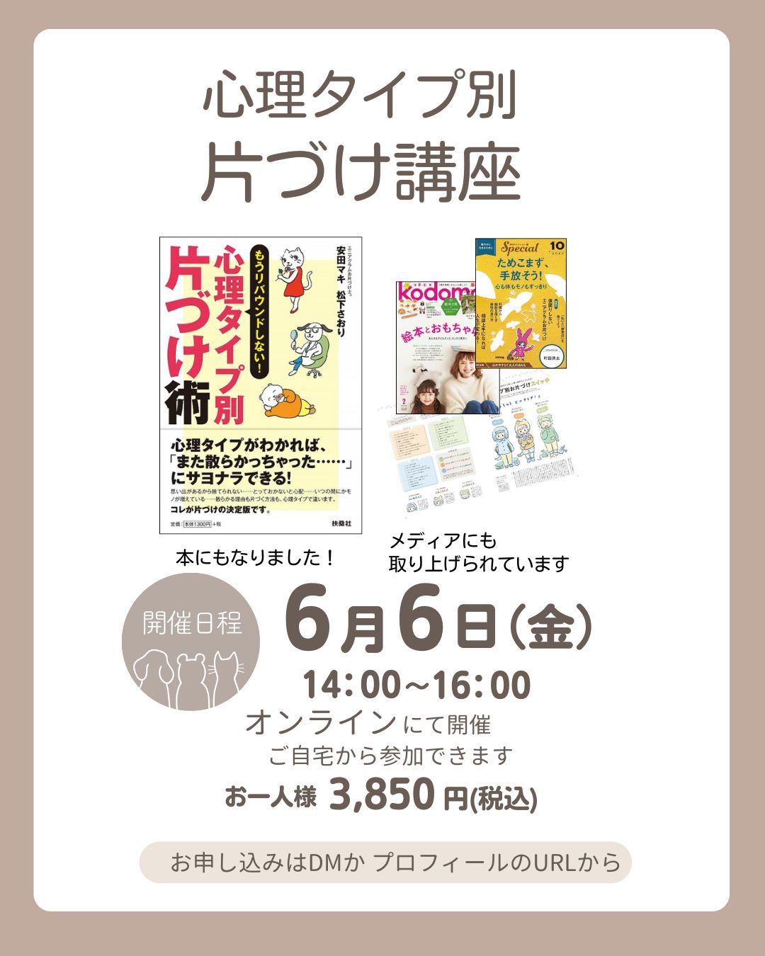 簡易診断で「くま」「ねこ」「いぬ」の3タイプに分け、タイプ別の片づけ方法を、ワークを交えながら学びます。