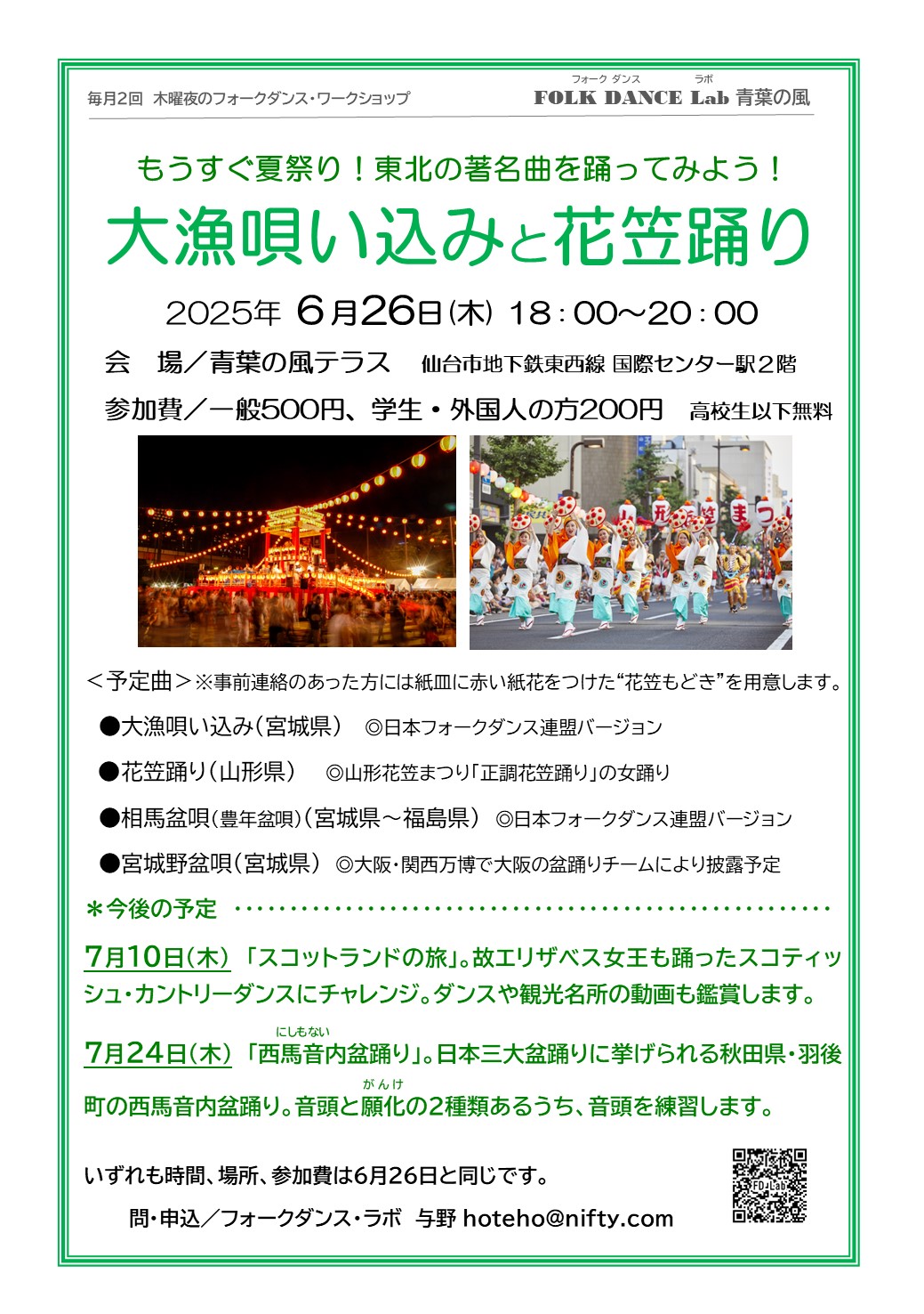 各国の踊りに親しむダンスワークショップ「フォークダンス・ラボ」。夏祭りの時期はもうすぐ。今回は日本のフォークダンスである、盆踊りの曲を取り上げます。東北の著名な踊りに親しんでみませんか? 踊りの経験は問いません、初めての方、大歓迎。どなたでもどうぞ。