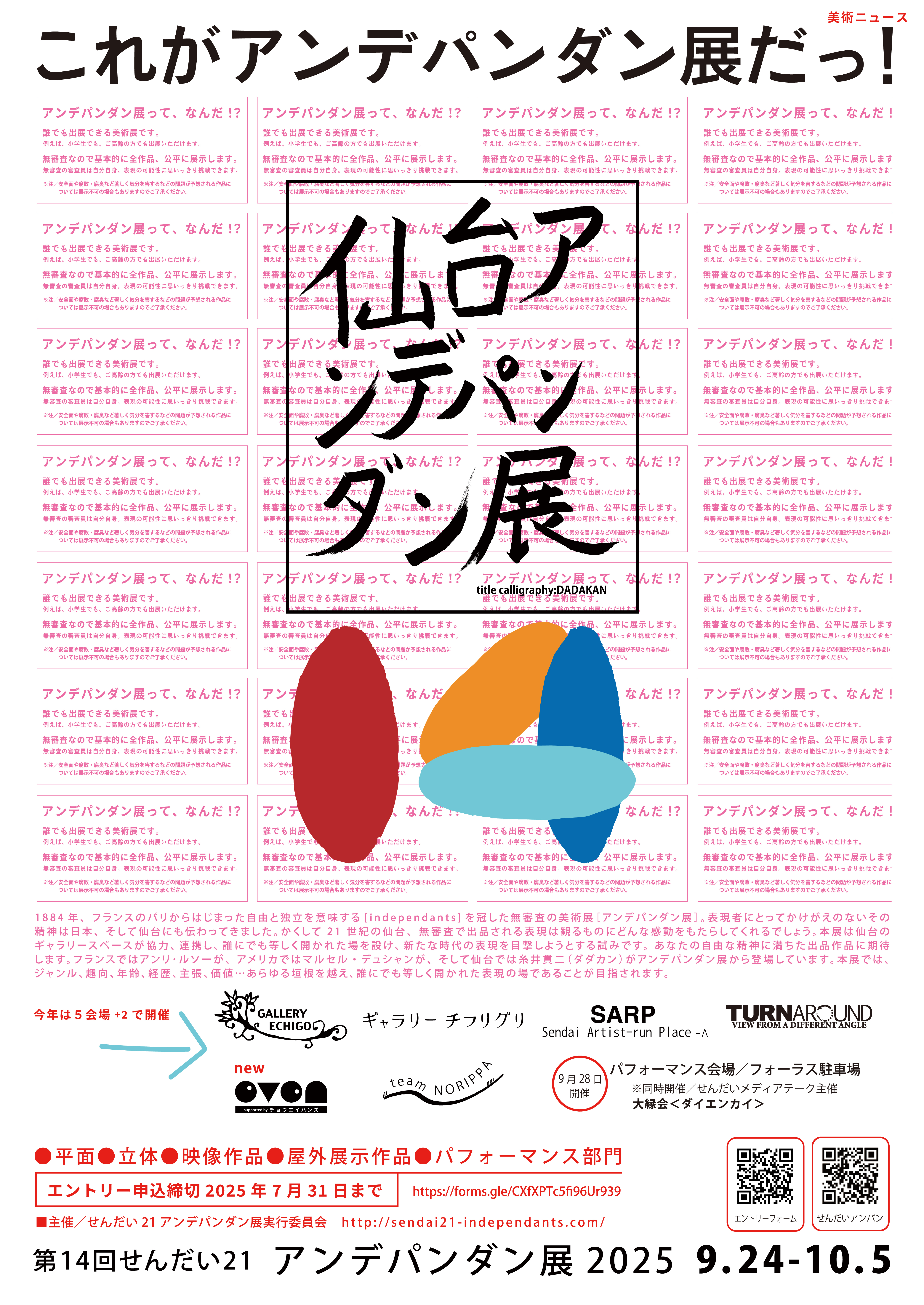 1884年、フランスのパリからはじまった自由と独立を意味する[independants]を冠した無審査の美術展[アンデパンダン展]。表現者にとってかけがえのないその精神は日本、そして仙台にも伝わってきました。かくして21世紀の仙台、無審査で出品される表現は観るものにどんな感動をもたらしてくれるでしょう。本展は仙台のギャラリースペースが協力、連携し、誰にでも等しく開かれた場を設け、新たな時代の表現を目撃しようとする試みです。 あなたの自由な精神に満ちた出品作品に期待します。フランスではアンリ・ルソーが、アメリカではマルセル・デュシャンが、そして仙台では糸井貫二(ダダカン)がアンデパンダン展から登場しています。本展では、ジャンル、趣向、年齢、経歴、主張、価値…あらゆる垣根を越え、誰にでも等しく開かれた表現の場であることが目指されます。