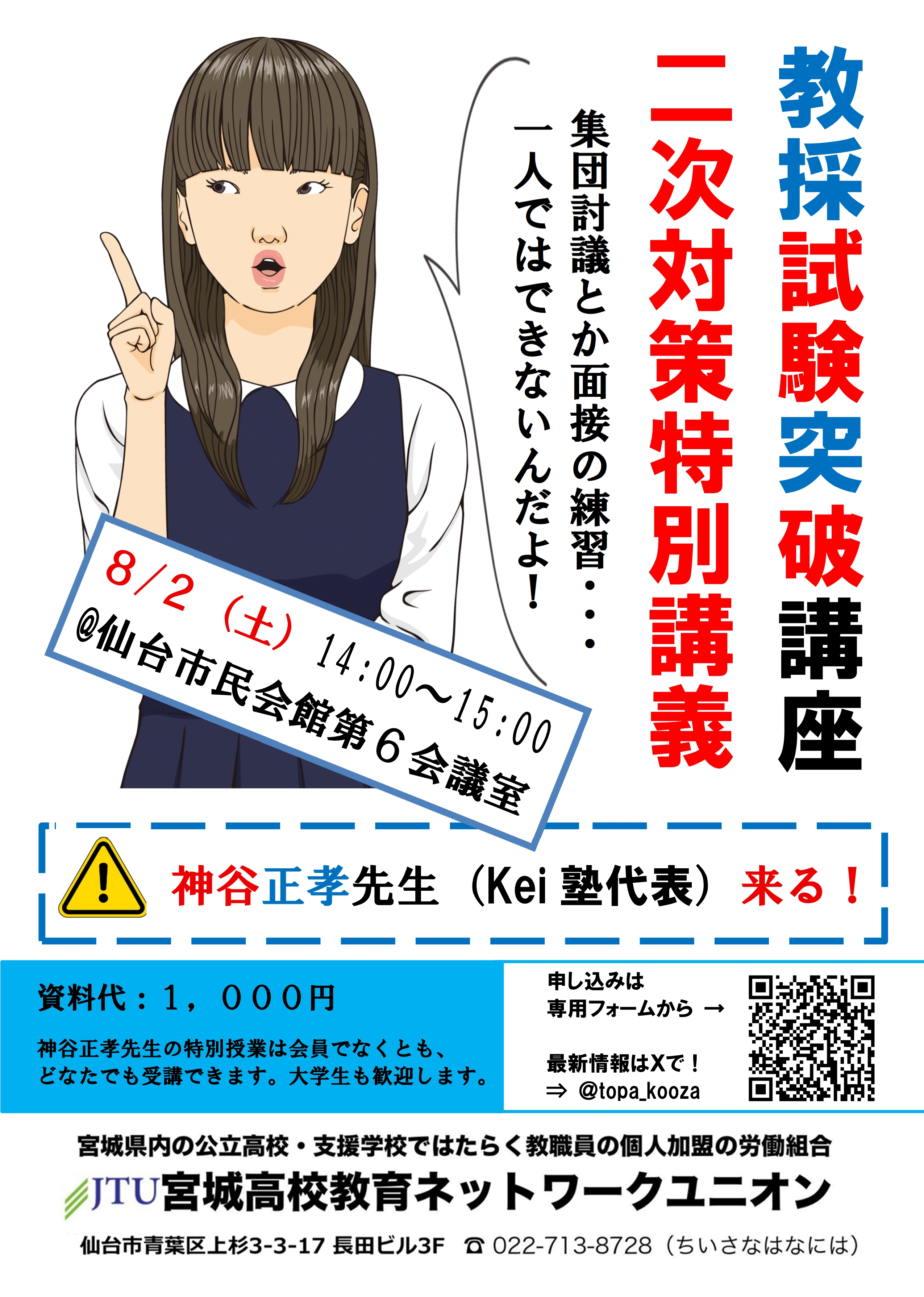 来る8月2日(土)の講座は、教採予備校Kei塾の代表、神谷正孝先生をお招きしての二次試験対策特別授業をおこないます。宮城県・仙台市教採二次試験を受験する方であればどなたでも受講できます。是非ご参加ください。