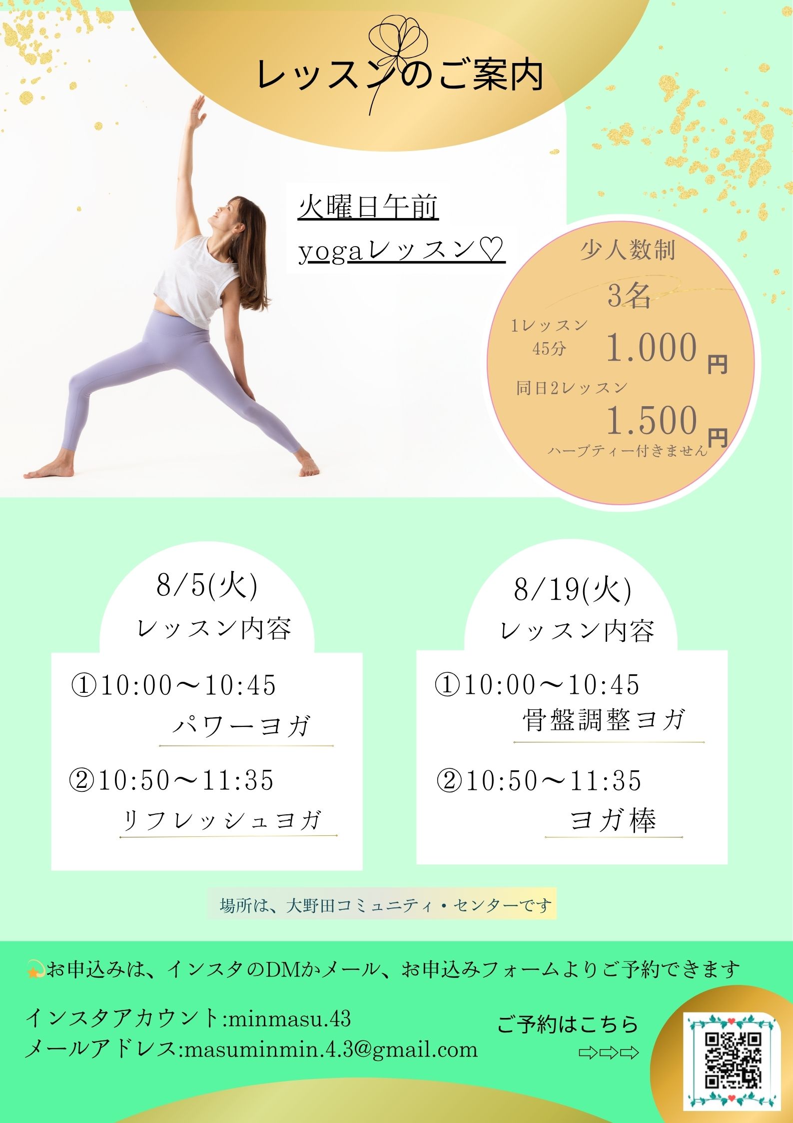 8月の火曜日ヨガレッスンは、下記をご覧下さい。