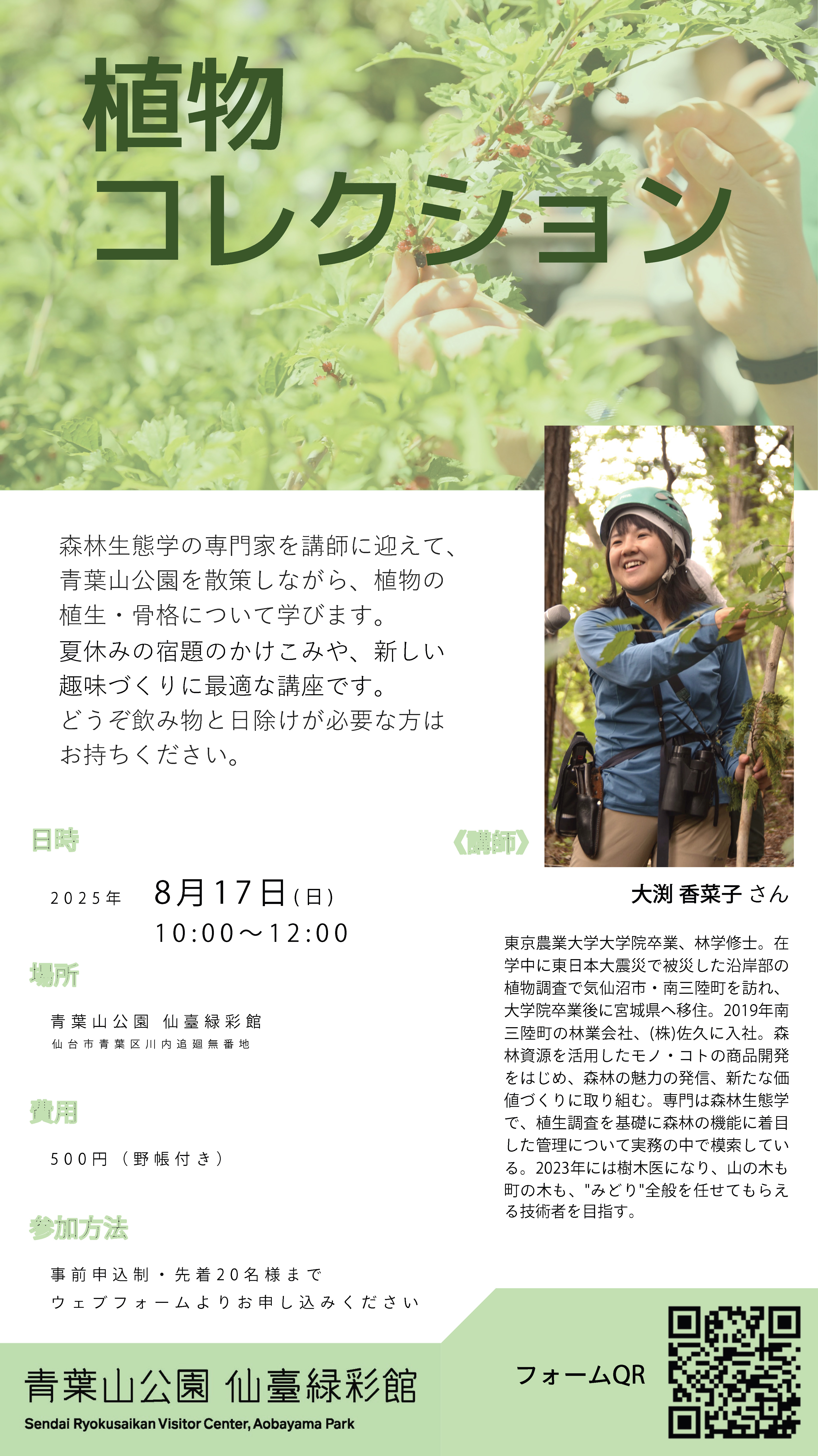 内容 森林生態学の専門家を講師に迎え、青葉山公園内を散策しながら植物の植生・骨格について学びます。野帳などの準備あり、飲み物と日除けが必要な方はお持ちください。