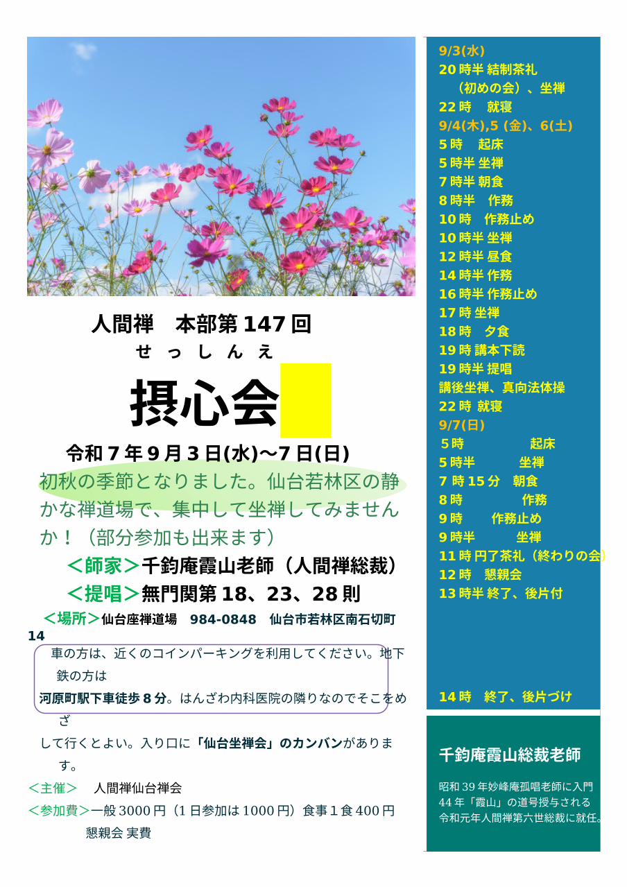 人間禅本部第147回摂心会(泊まり込みの合宿形式の座禅会。もちろん一部のみ参加もできます)