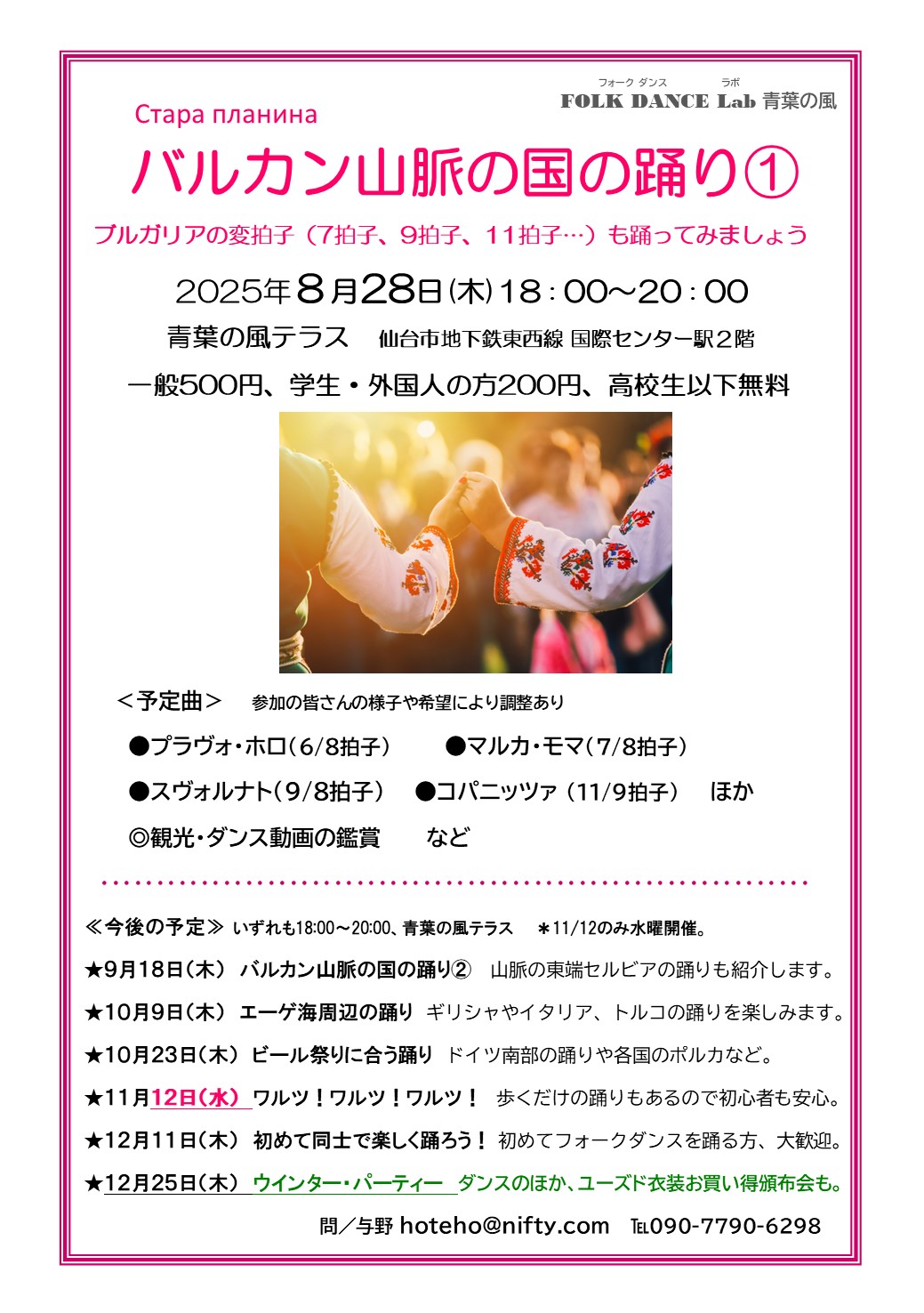 バルカン半島の名の由来にもなっているバルカン山脈。セルビアとブルガリアの国境から東へ、ブルガリアを東西に横切って延びる長大な山脈です。周辺には北ブルガリア地方、ショップ地方、トラキア地方があり、ここには変化に富んだフォークロアの踊りが息づいています。軽快な2拍子、4拍子系の踊りもたくさんありますが、変拍子の踊りも多いのです。5拍子、7拍子、9拍子、11拍子など。やさしいシンプルな踊りを選んで、変拍子の踊りを楽しんでみます。どなたでもどうぞ。ふだんパーカッション演奏をされている方も、ぜひご参加ください。一緒に叩いて踊って楽しみましょう!