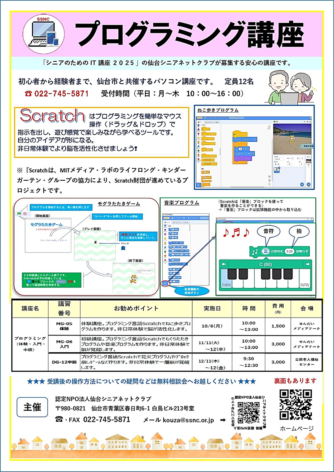 「シニアのための IT 講座 2025」の仙台シニアネットクラブが募集する安心の講座です。