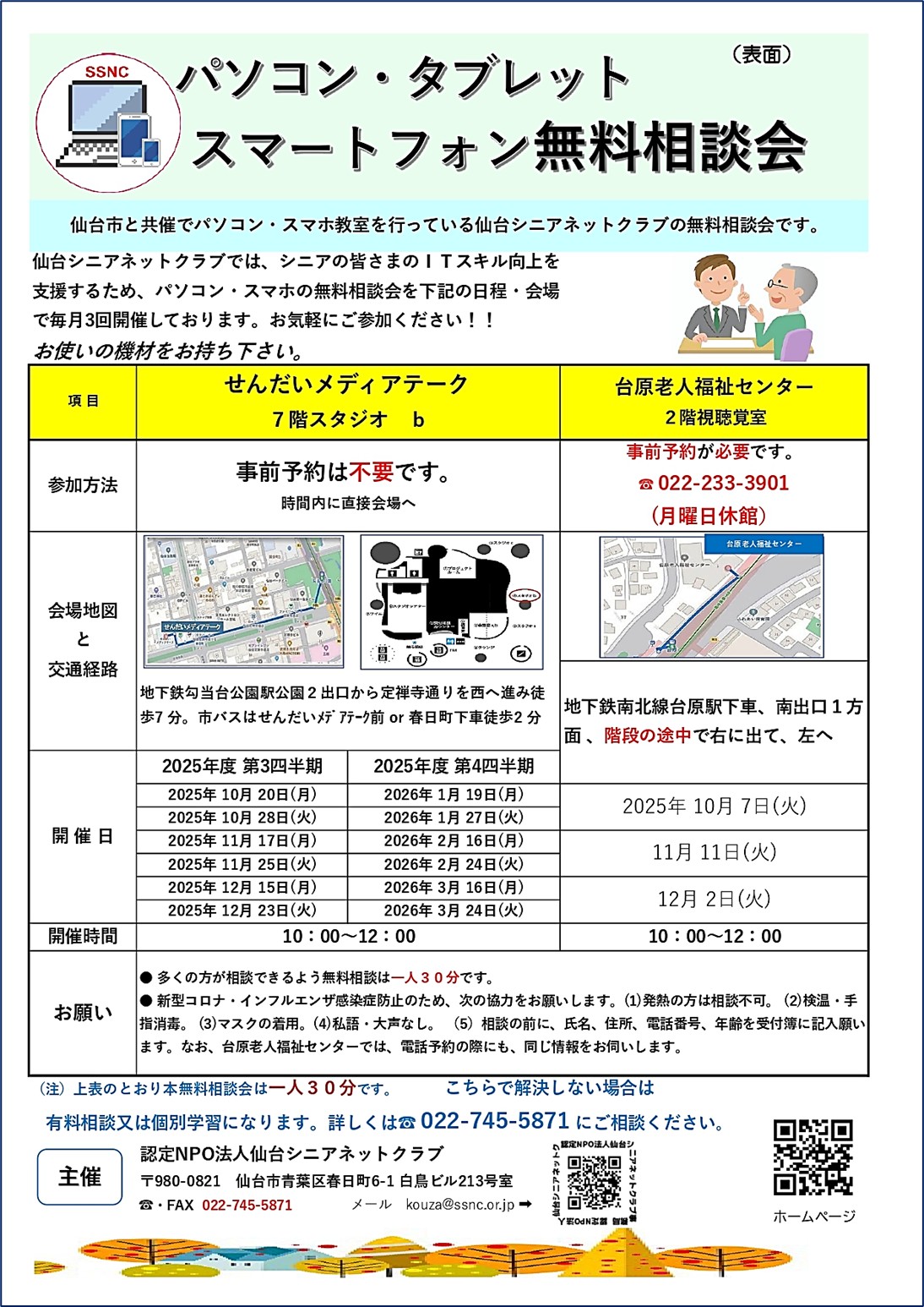 仙台市と共催でパソコン・スマホ教室を行っている仙台シニアネットクラブの無料相談会です。
