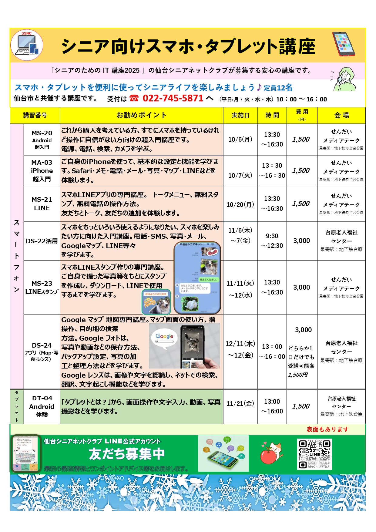 「シニアのための IT 講座2025」の仙台シニアネットクラブが募集する安心の講座です。