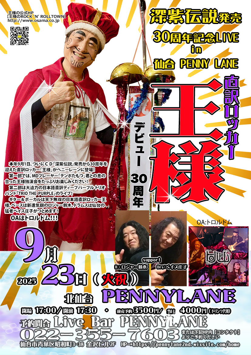 9/23(火祝)17:30~、宮城県仙台市は、北仙台駅近くのライブバー『ペニーレーン』にて、王様CDデビュー・30周年記念ライブ!