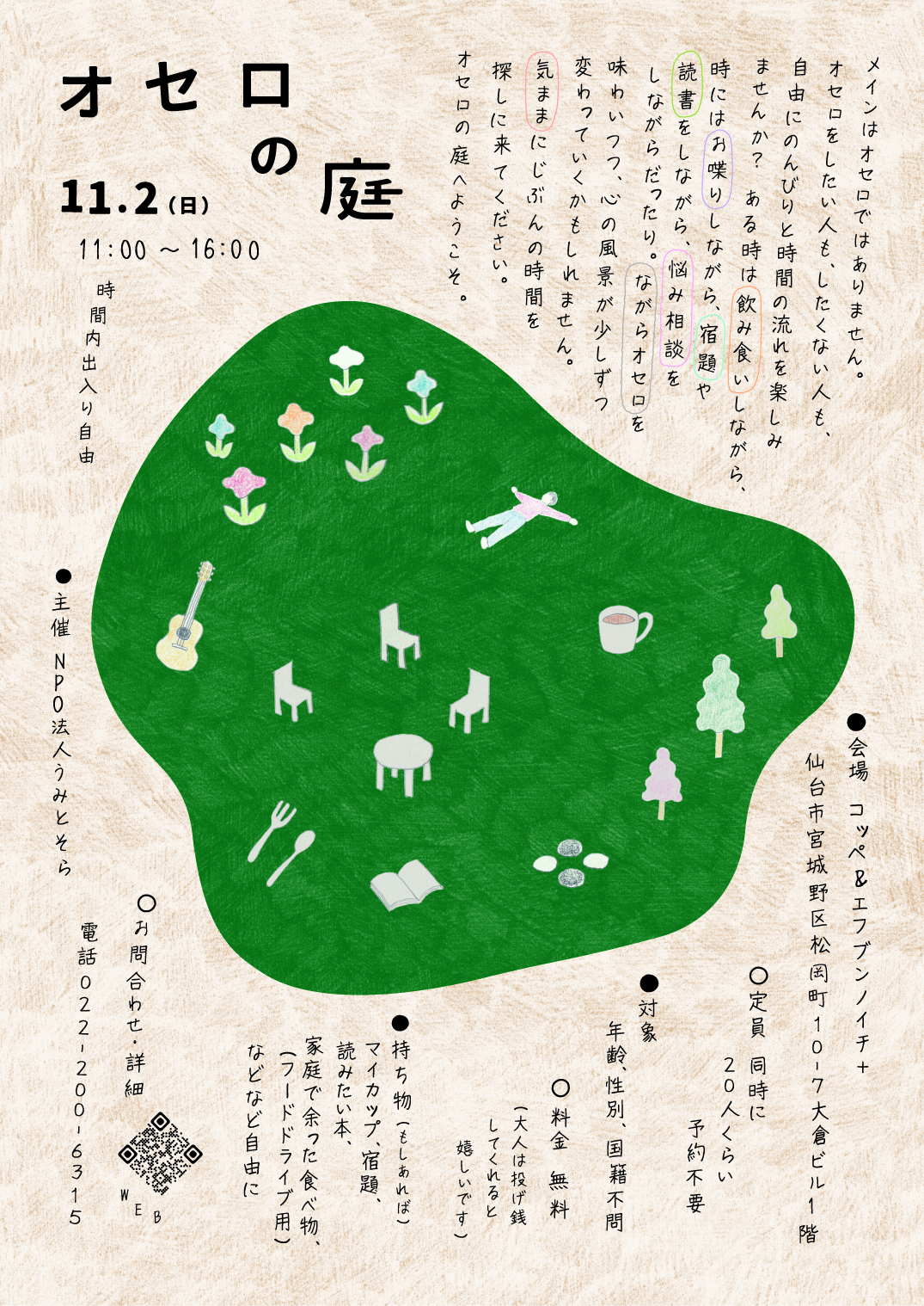 年齢、性別、国籍、居住地区不問、他地域のかたも大歓迎です。