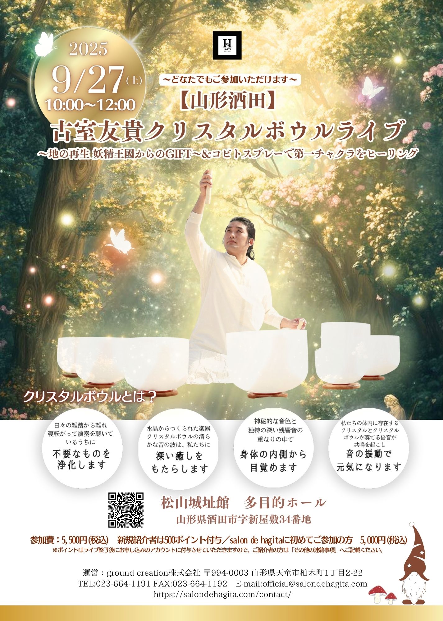 9/27(土) 【酒田】 古室友貴クリスタルボウルライブ ~地の再生 妖精王國からのGIFT~&コビトスプレーで第一チャクラをヒーリング