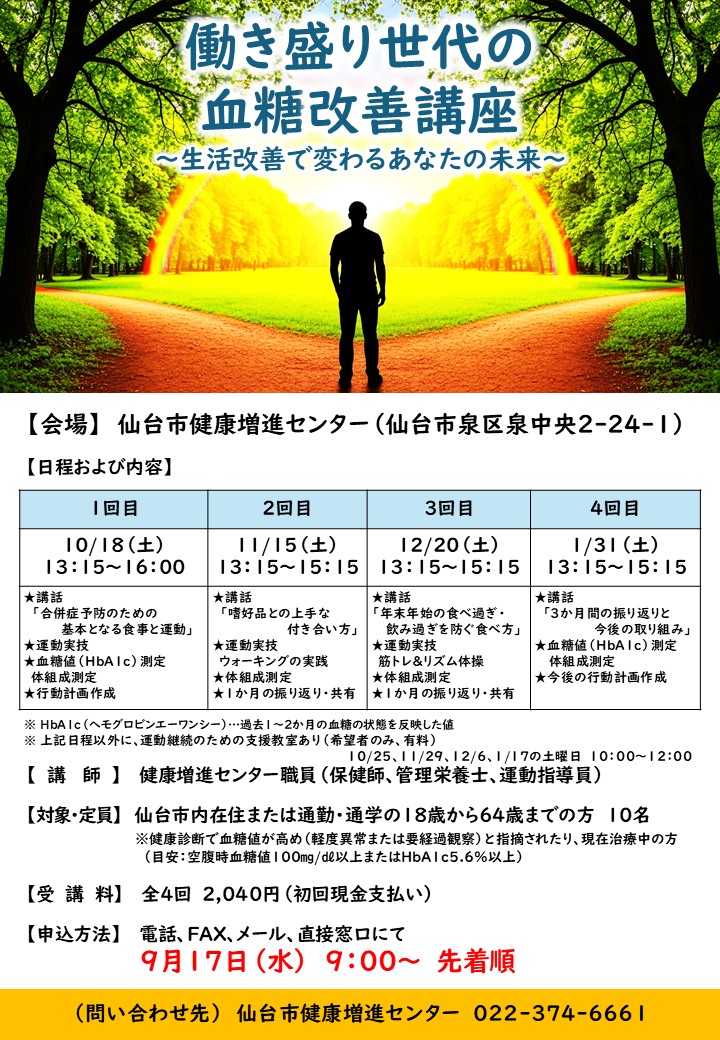 仙台市健康増進センターでは、血糖改善に向けた栄養指導や運動実技を含む全4回の講座を行います。