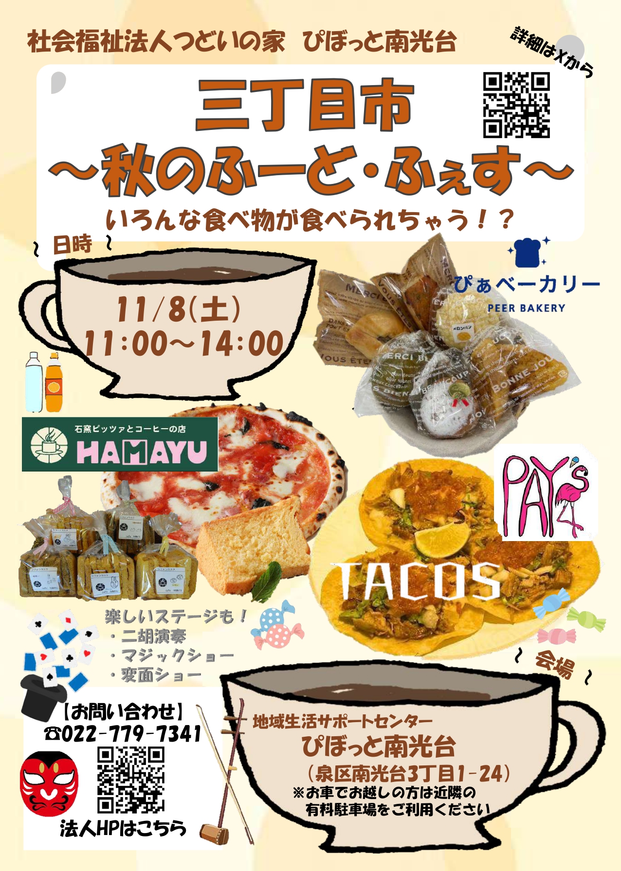 昨年度ご好評をいただいた「三丁目市~秋のぱん・ふぇす~」に続き、今年度も地域の方々との交流イベントを開催いたします。パンや焼き菓子、タコスなどの食品販売や、マジックショー、変面ショー、二胡演奏などのプログラム、駄菓子すくい等、楽しい催しものをご用意いたしております。お子さまのご来場も大歓迎です! 購入したものを食べながら談笑したり、パフォーマンスを鑑賞しながら、食欲の秋、芸術の秋を楽しみましょう(*^-^*)みなさまのご来場をお待ちしております!