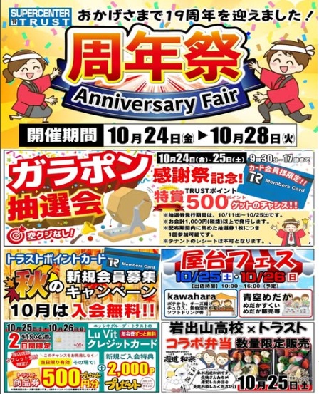 宮城県大崎市岩出山にあるスーパーセンタートラストにて、周年の屋外屋台村を開催します。