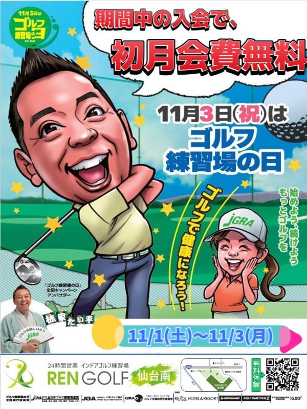 JGRA「ゴルフ練習場の日」連動特別企画! RENGOLFのとってもお得な3日間♪ 期間中に無料体験にお越し頂き新規入会すると、初月会費無料!入会金半額!