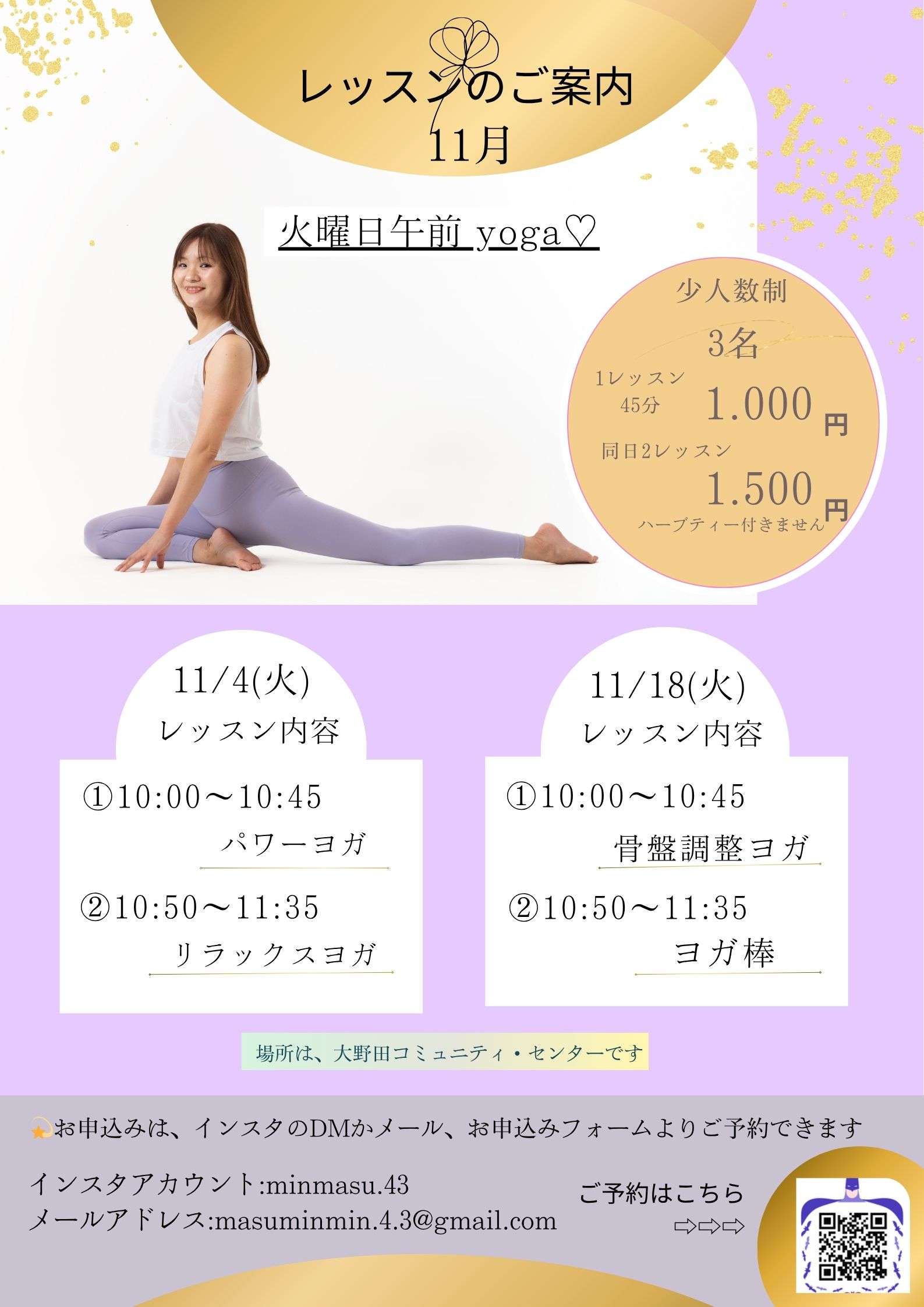 ※ヨガマットのお貸出しを行っていますので、事前にご連絡をお願いします。