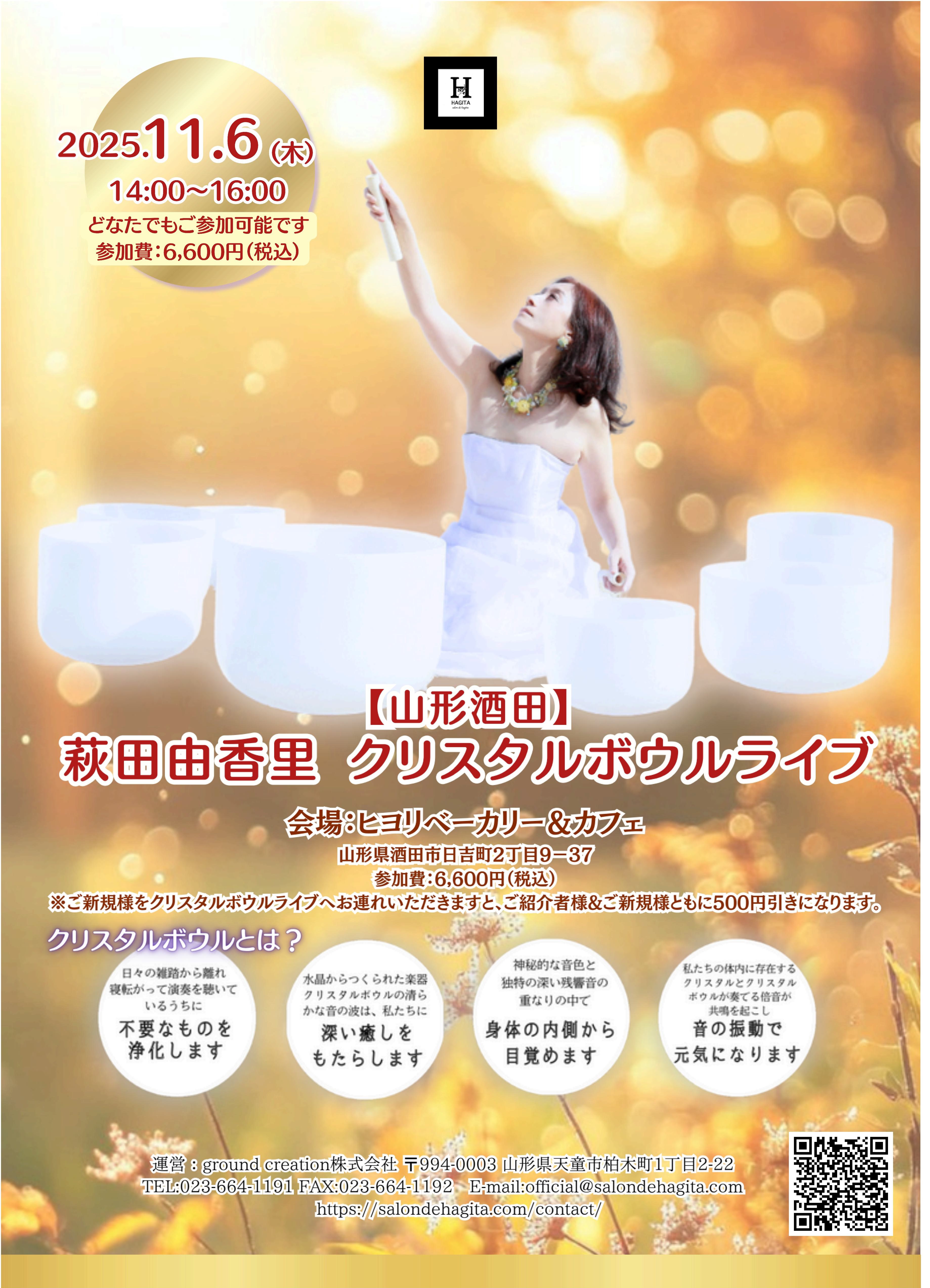 にてsalon de hagita 代表 萩田由香里によるクリスタルボウルライブが庄内 初開催となります!!