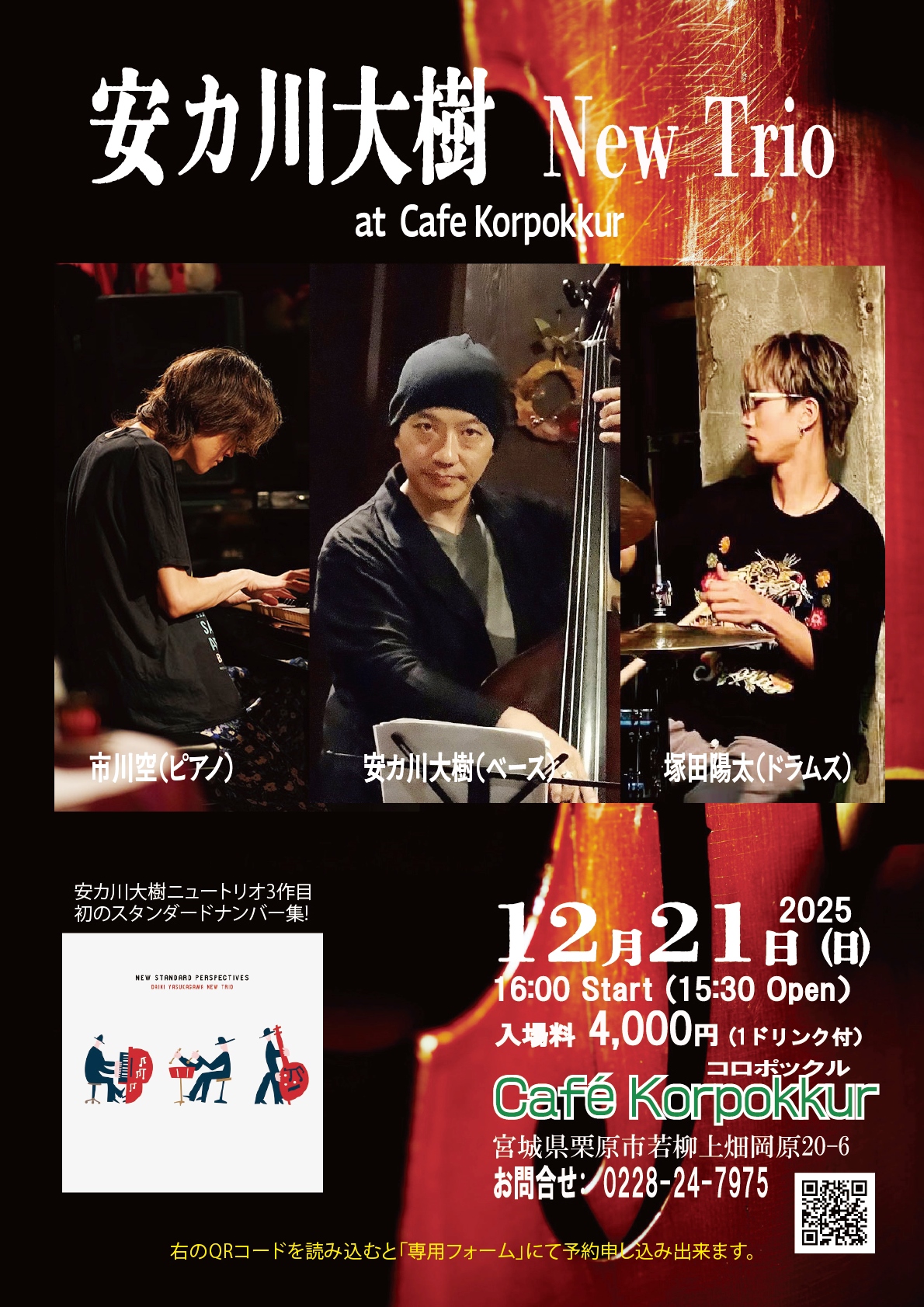 多くの有名ミュージシャンと共演を重ね、今やベテランの域に達した人気ベーシスト安カ川大樹。彼の2023年に結成したニュートリオでのライブです。ピアニストの市川空とドラムの塚田陽太は20代前半の若くて才能豊かなミュージシャン。今、最も注目されているピアノトリオです。昨年もコロポックルのステージに登場し、大喝采をあびました。今回は新しいアルバム「New Standard Perspectives」の発売記念ツアーの一環でのライブとなります。