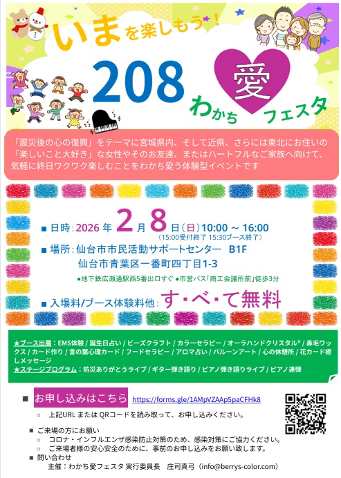 心の震災復興をテーマにした完全無料イベント「いまを楽しもう!208わかち愛フェスタ」が、2026年2月8日(日)に開催されます。