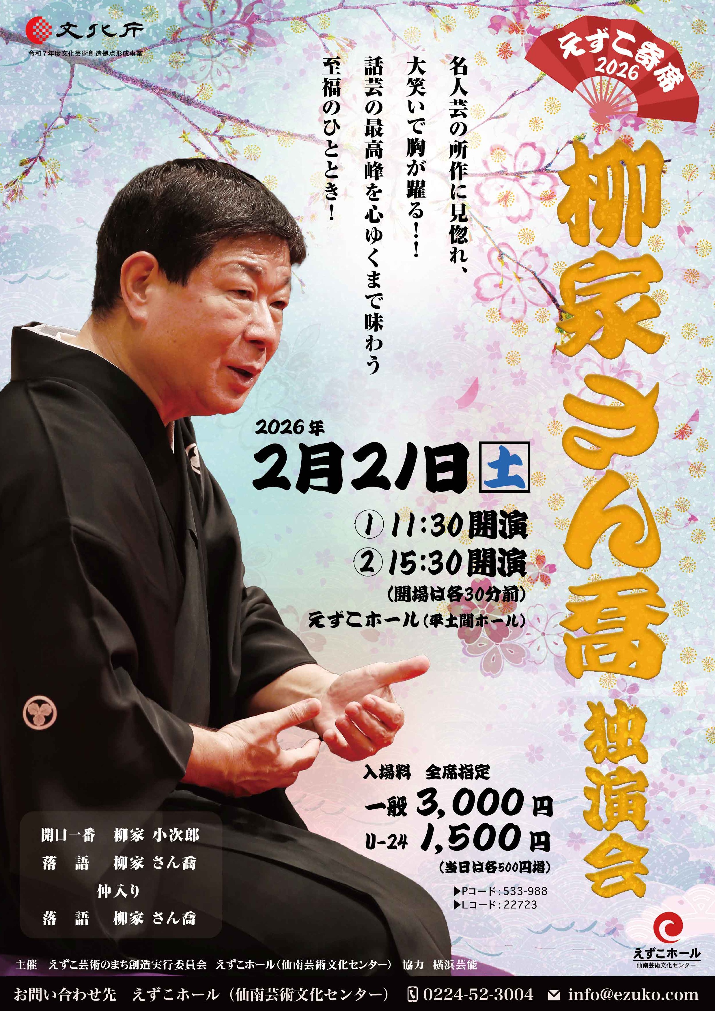 さん喬の落語は、まさに名人芸。滑稽噺で笑って、人情噺でほろりと涙がこぼれる。芸術選奨文部科学大臣賞をはじめ、数々の受賞歴を持ち、落語協会会長を務める現世を代表する噺家。必見!!