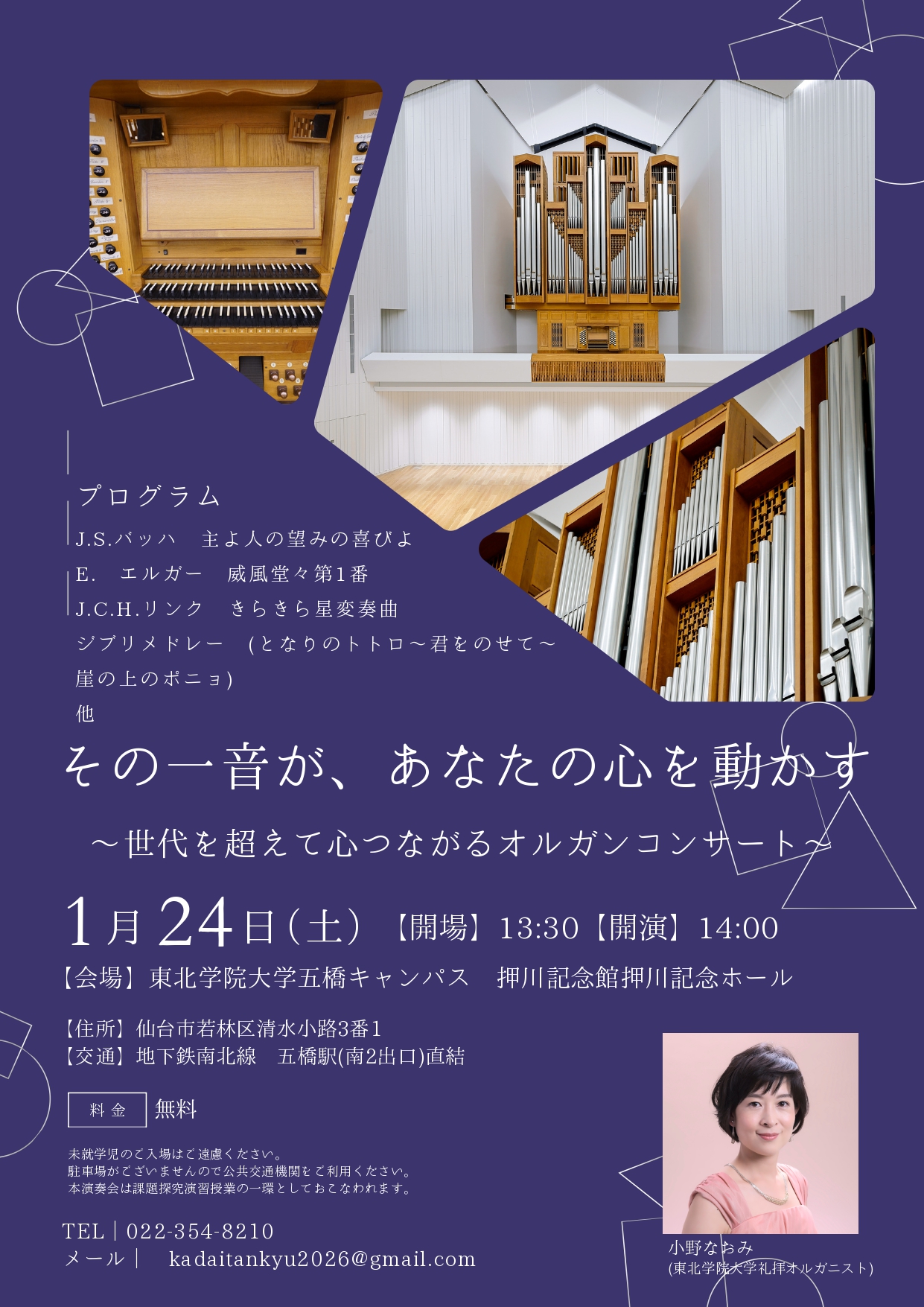 東北学院大学パイプオルガン演奏会『その一音が、あなたの心を動かす』開催のお知らせ。(1/24)