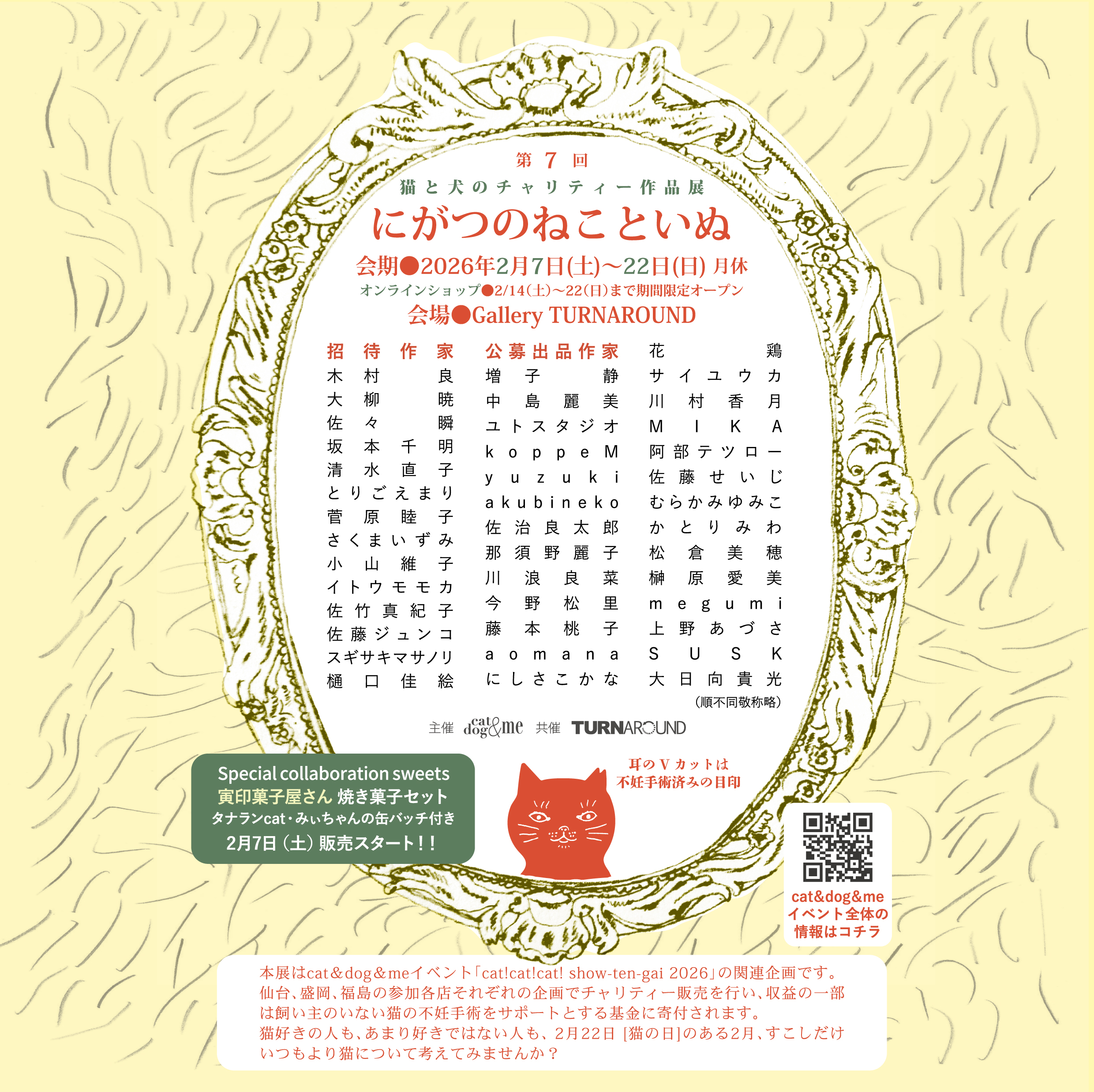 本展は、「2月22日=猫の日」から猫の月として定着しつつある2月に行うcat&dog&me主催の「cat!cat!cat! 2026」企画に賛同したチャリティアート展です。