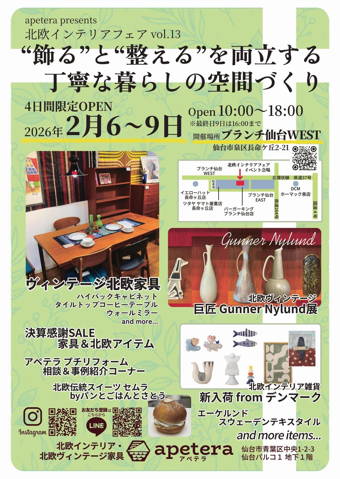 北欧インテリア&家具のセレクトショップ「apetera アペテラ」が、2026年2月6~9日の4日間限定、ブランチ仙台(仙台市長命ケ丘2-21)で開催する家具・インテリアのショッピングイベント。