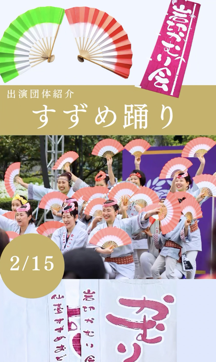 仙台を代表する郷土芸能「仙台すずめ踊り」1祭連(団体)の上演と体験ワークショップを開催します。